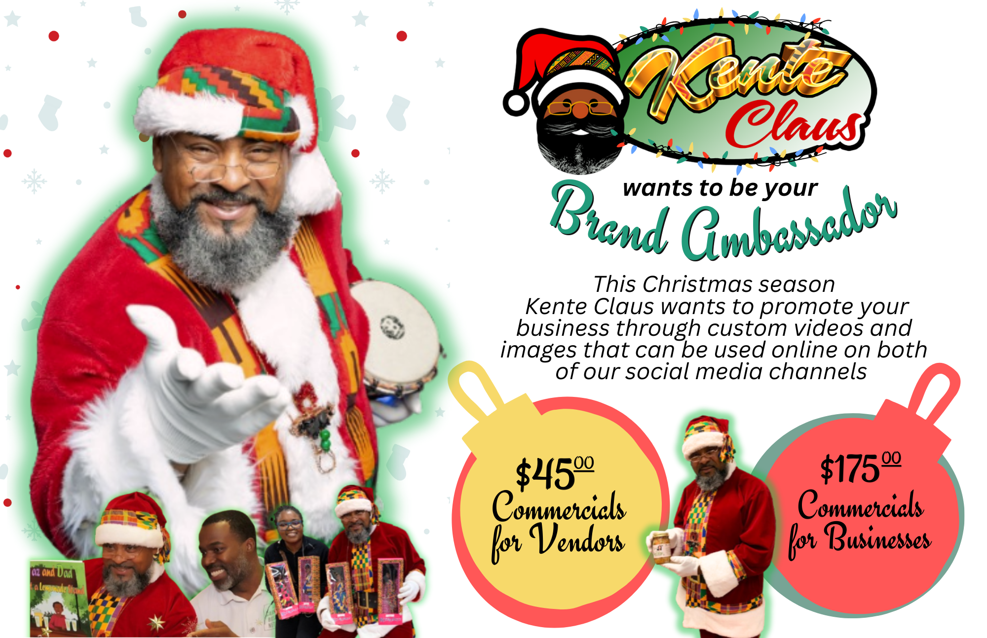Have Kente Claus promote your product, service or brand online through videos, live appearances and promotional photos.