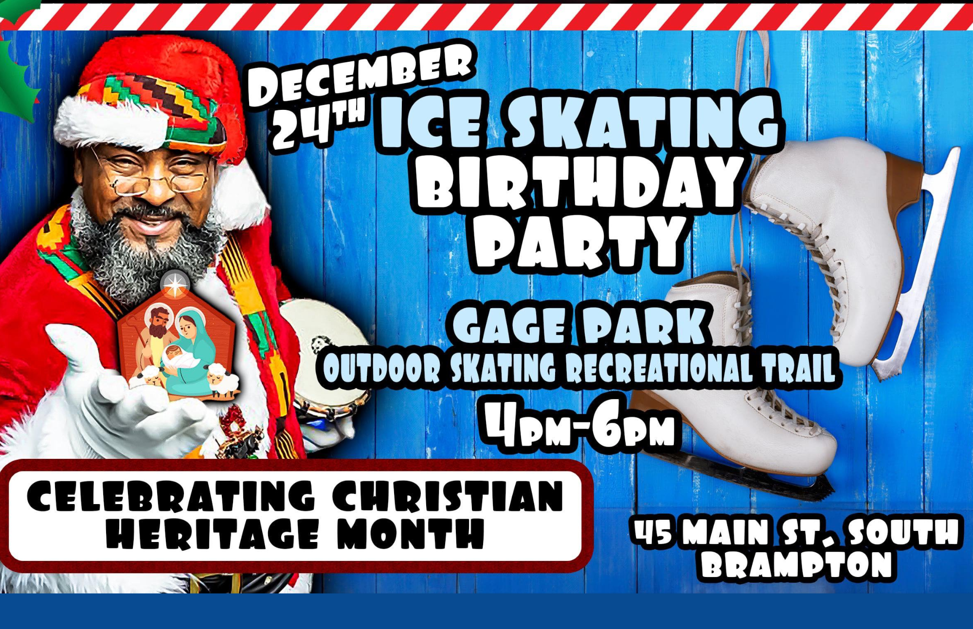 Celebrating Christian Heritage Month, come and join Kente Claus for an Ice Skating Birthday Party this December 24th at Gage Park Outdoor Skating Recreational Trail